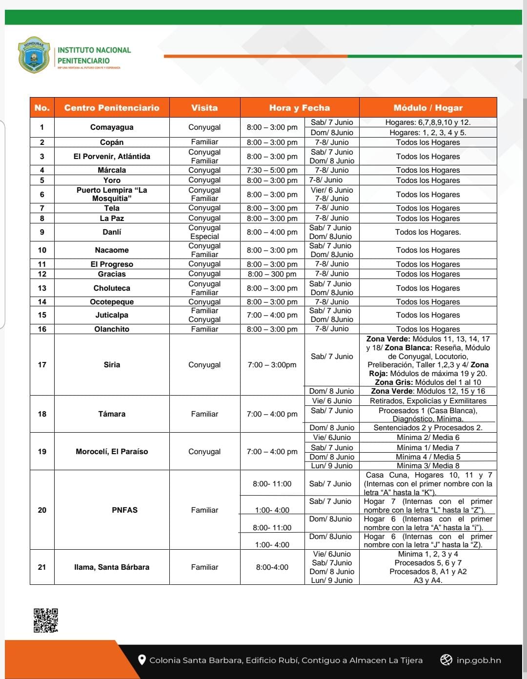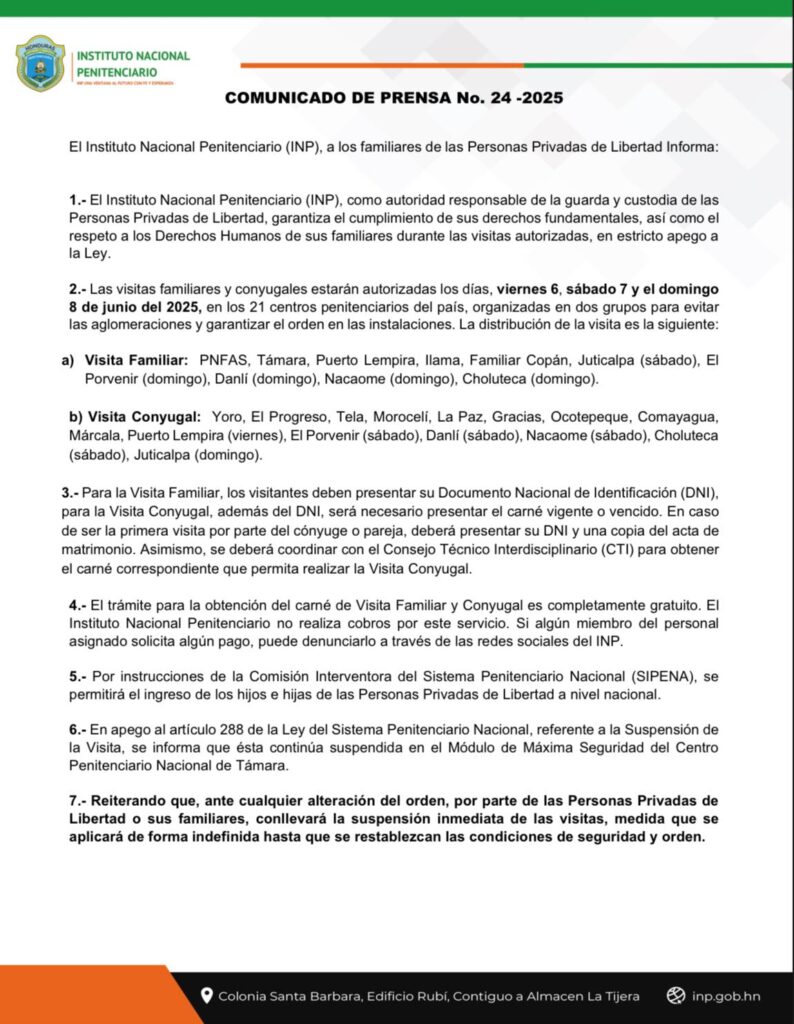 El Instituto Nacional Penitenciario informa que las visitas familiares y conyugales se realizarán de forma regular en los 21 Centros Penitenciarios del país este fin de semana, como parte del compromiso con la Rehabilitación y la Reinserción social.