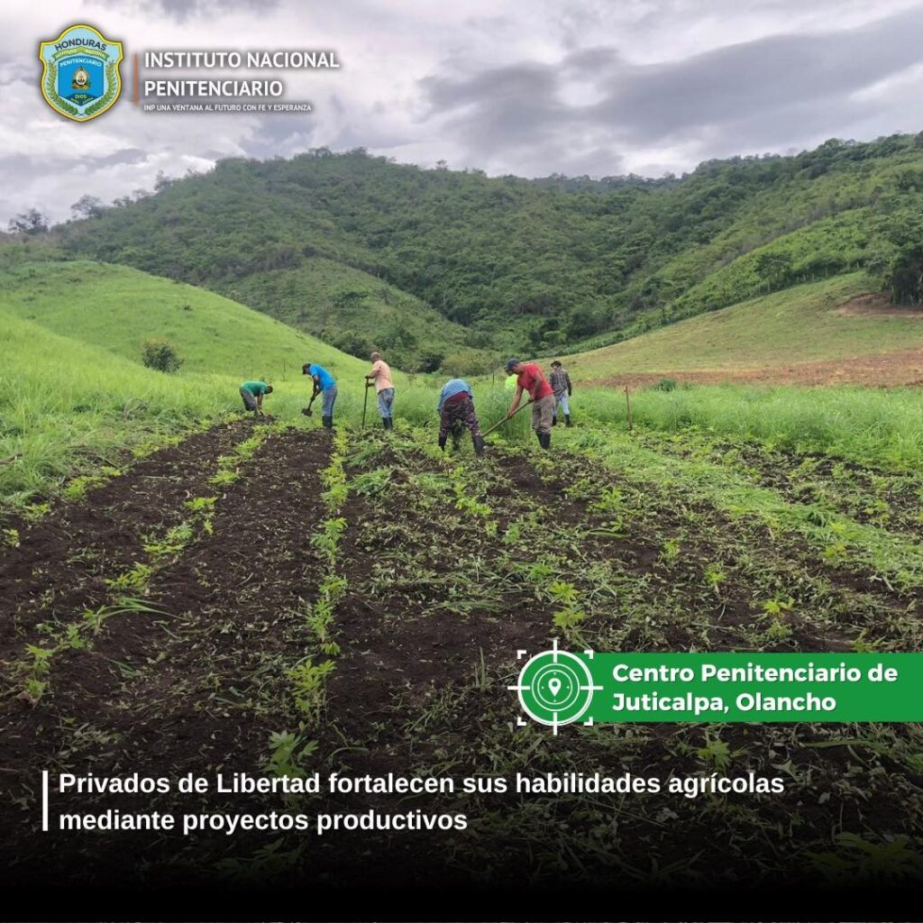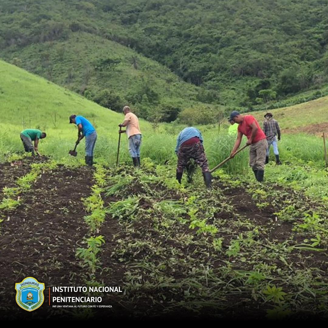 Como parte de su proceso de capacitación para el trabajo establecido en el Programa de las 3R’s, un grupo de privados de libertad del Centro Penitenciario de Juticalpa, Olancho; realizan trabajos en las áreas de cultivo de maíz y yuca.