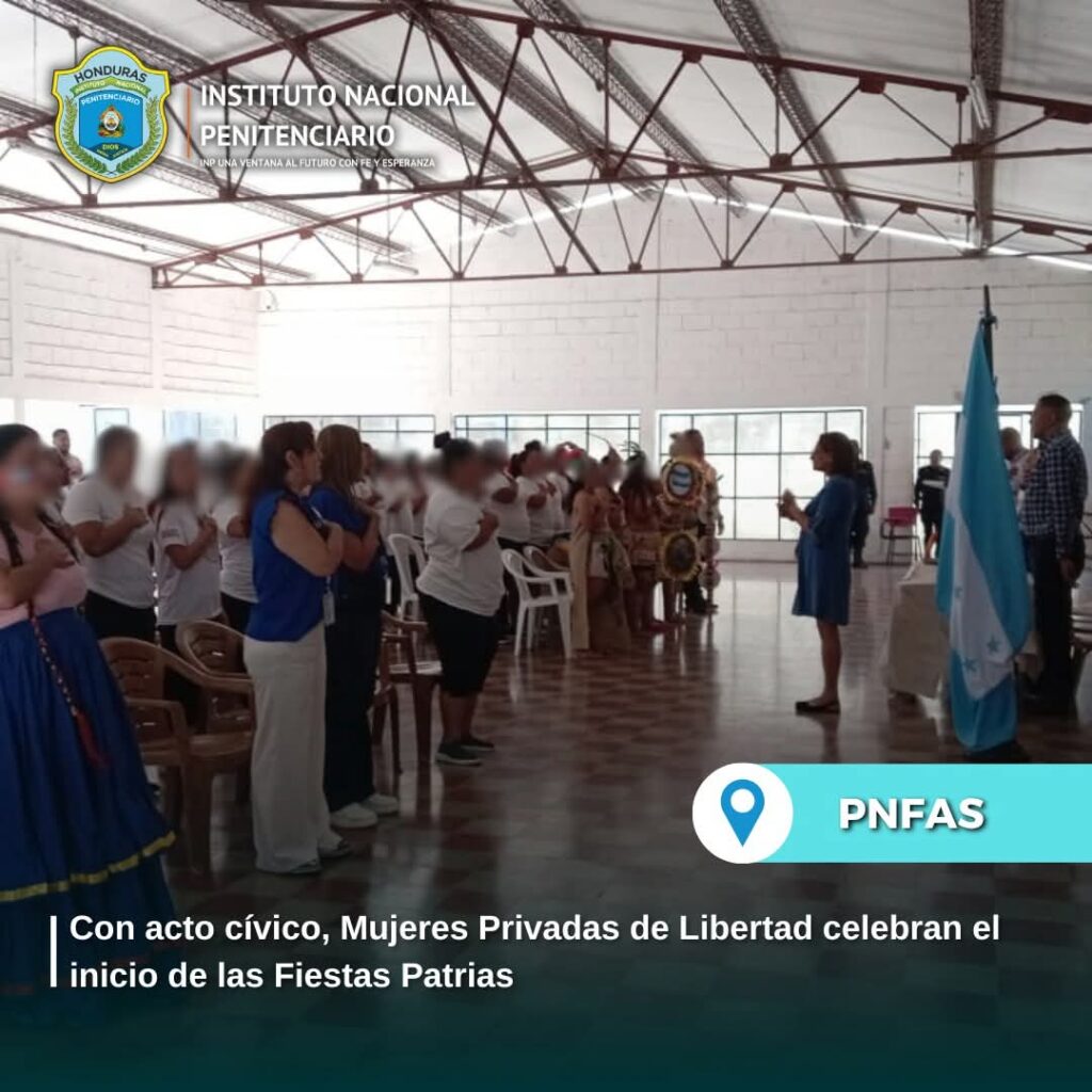 Con entusiasmo y fervor patrio, las Mujeres Privadas de Libertad que estudian en el Centro de Educación Básica Pastor Mario Fumero, en la Penitenciaría Nacional Femenina de Adaptación Social (PNFAS), llevaron a cabo un emotivo acto cívico para dar inicio a las celebraciones de las Fiestas Patrias.