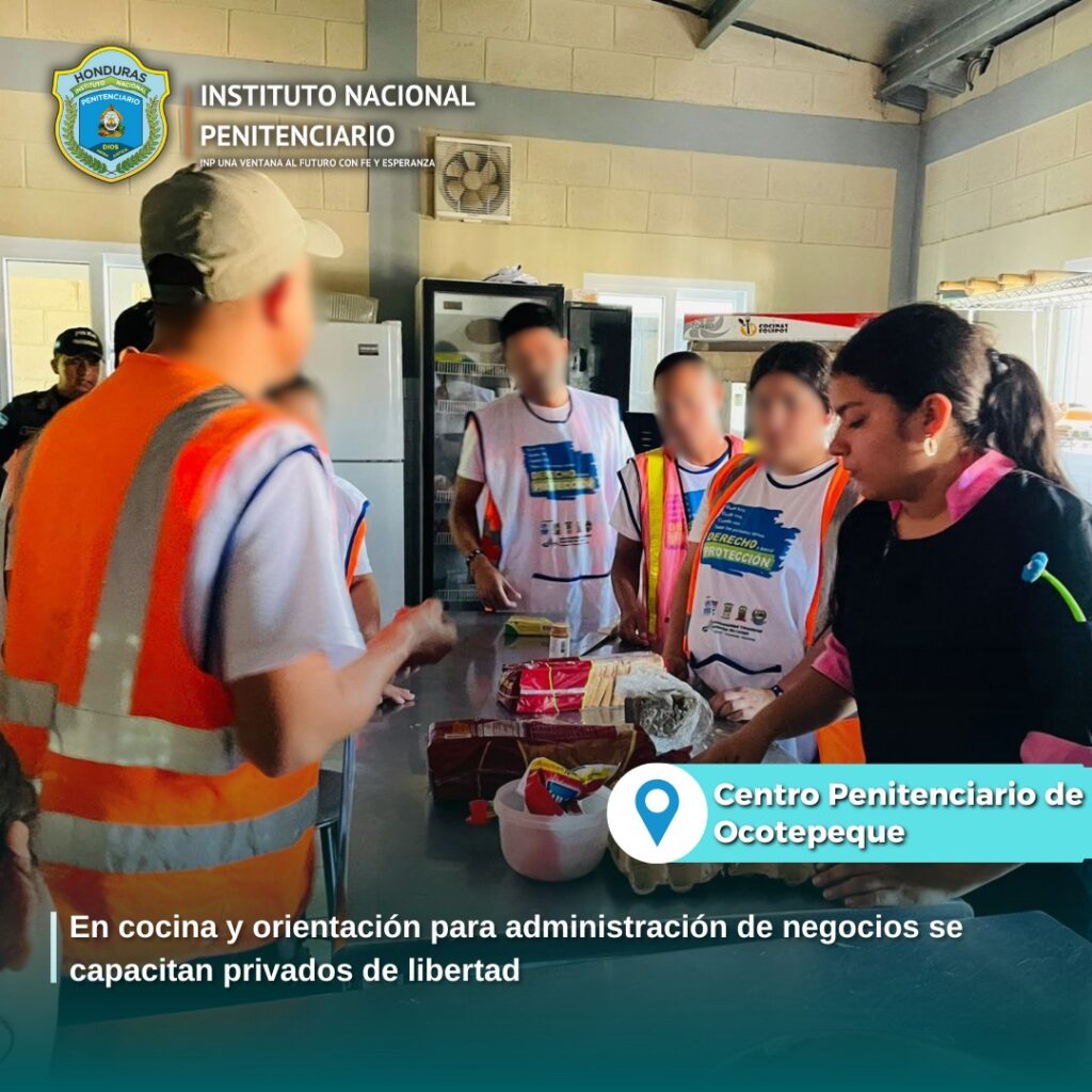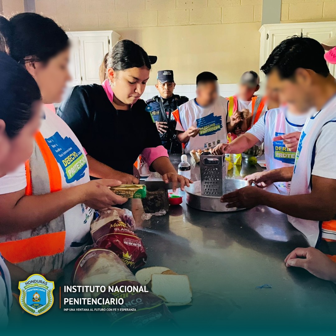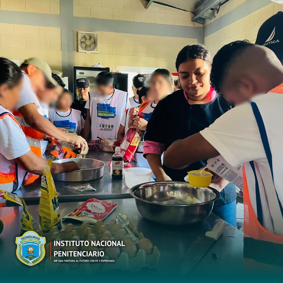 17 privados de libertad del Centro Penitenciario de Ocotepeque, participan en cursos de cocina especializados en la elaboración de postres y repostería, estas actividades se complementan con orientación en administración de negocios.