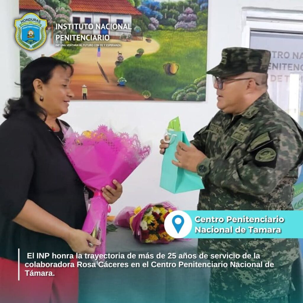 En un emotivo acto, el Instituto Nacional Penitenciario , a través del Centro Penitenciario Nacional de Támara, rindió homenaje a la señora Rosa Cáceres, quien por más de 25 años de servicio en la labor penitenciaria, fue beneficiada con su cesantía otorgada por las autoridades correspondientes.