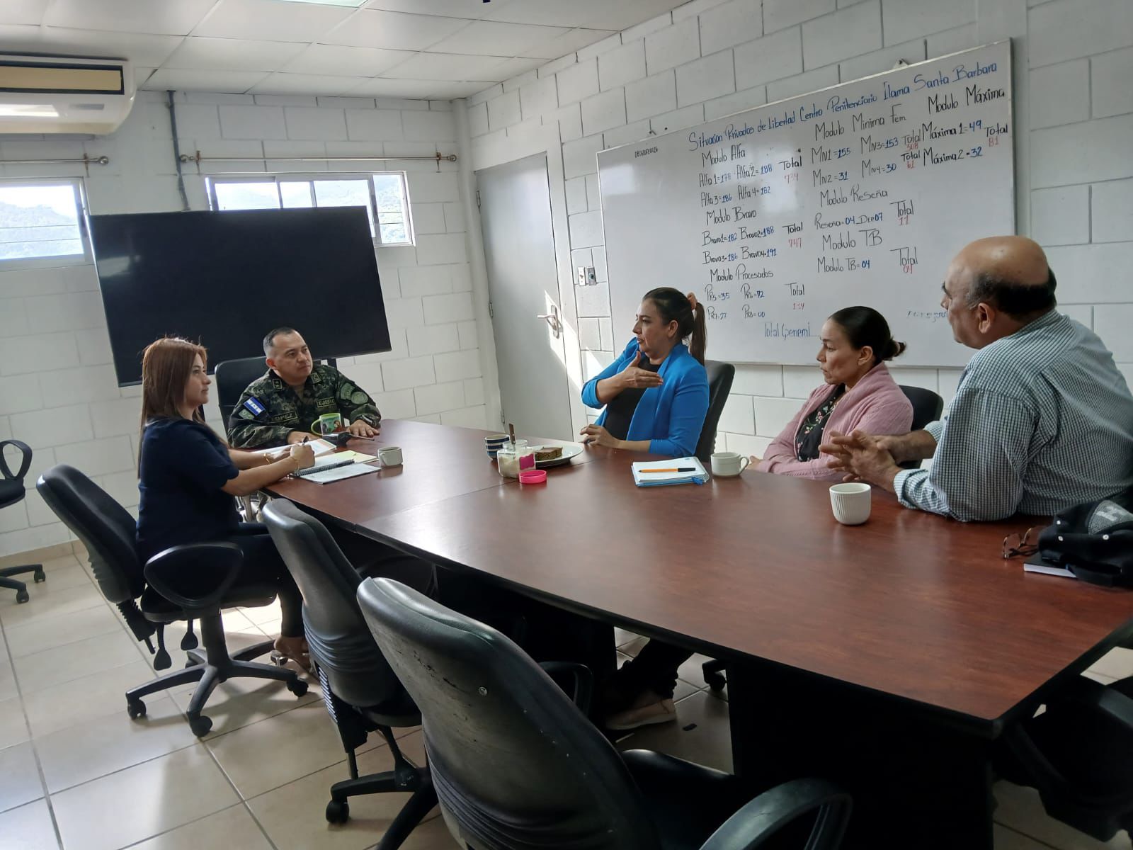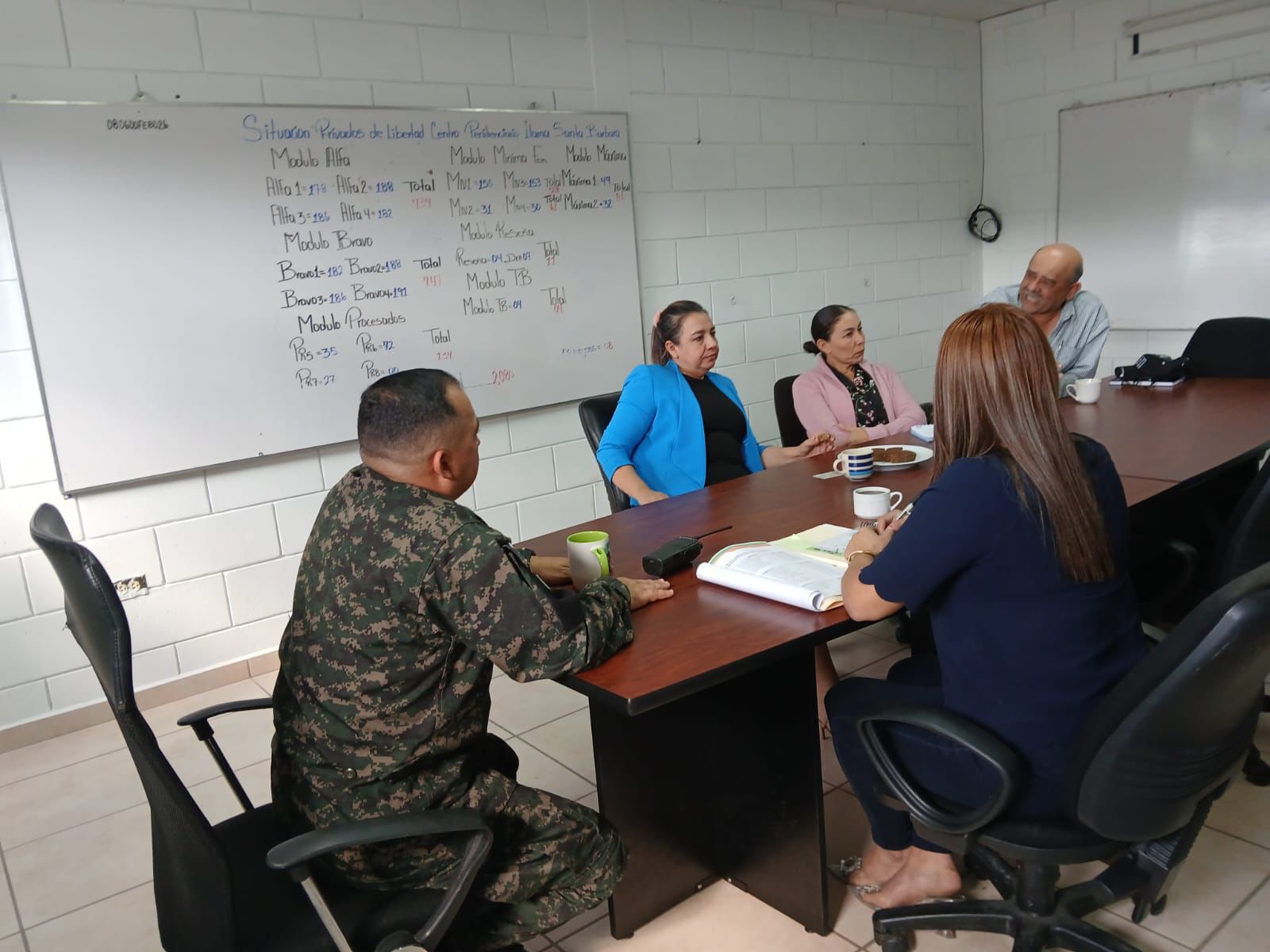 Autoridades del Instituto Nacional Penitenciario (INP) afinan detalles para la creación de la Escuela e Instituto «Fe y Edperanza»,con la directora departamental de Educación del Departamento de Santa Bárbara, Máster Sonia Reyes, la coordinadora de modalidades educativas y de los programas de educación, y personal de para la creación de Departamento de Pedagogía del recinto.